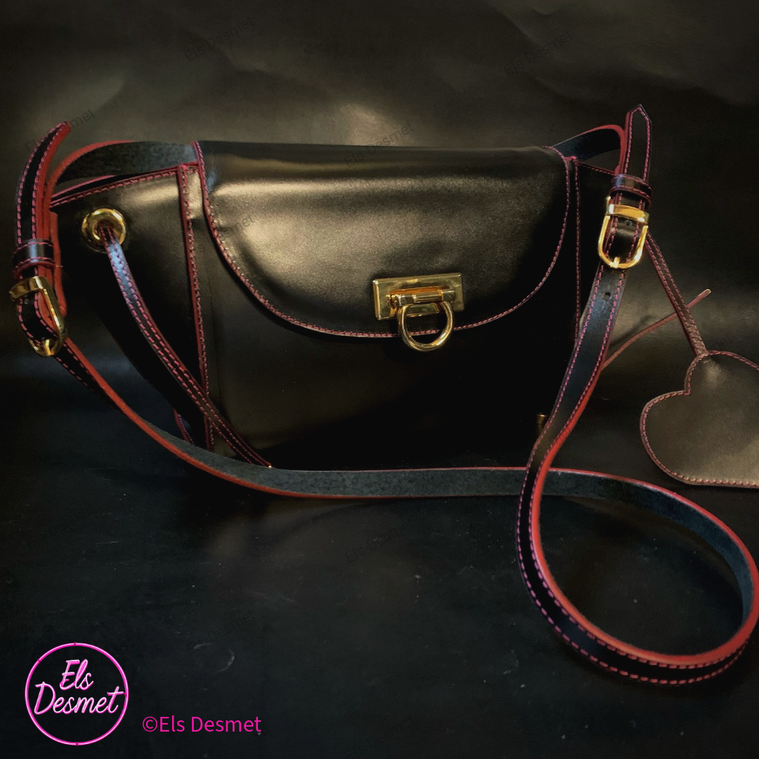 Black leather accented with electric pink stitching, finished with a versatile carrying system.